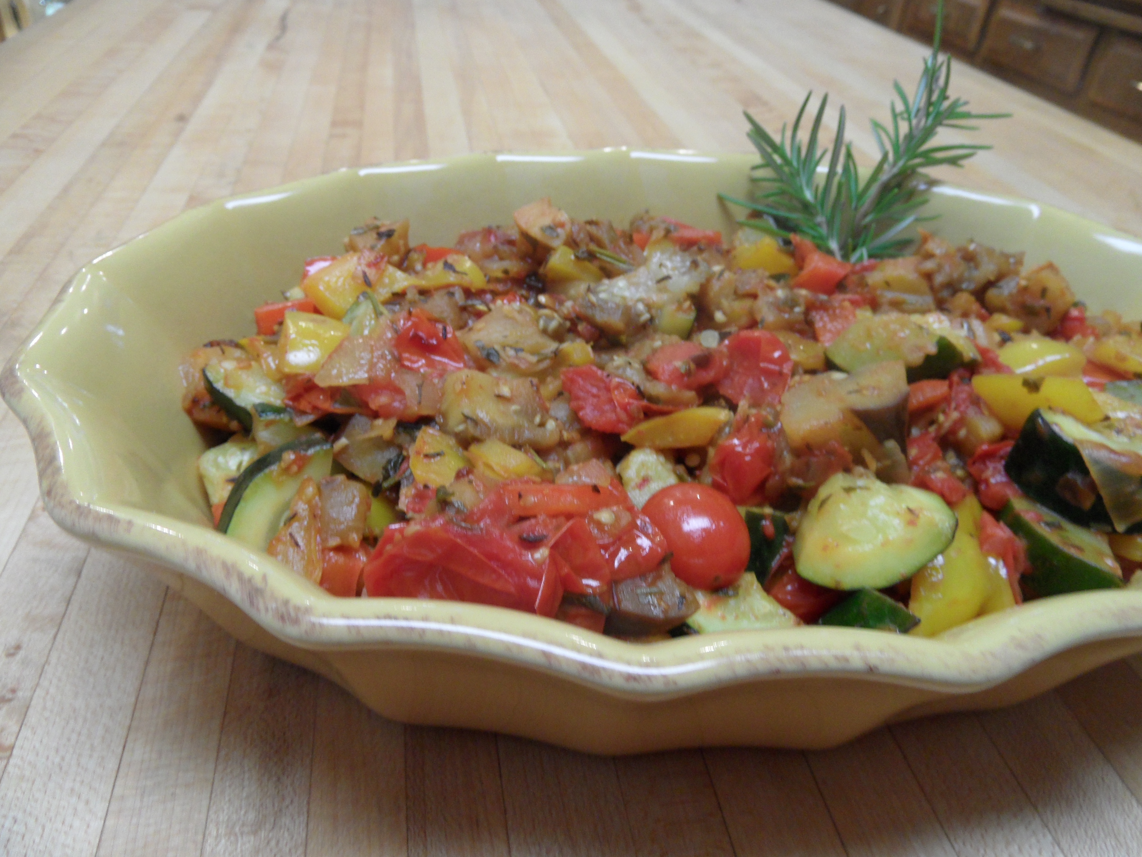 Ratatouille By Sally | Published February 28, 2012 | Full size is 4000 × 3000 pixels food2 008 food2 008 Ratatouille eggplant, onions, zucchini, red pepper, garlic, tomatoes, lavender, rosemary, thyme and oregano Bookmark the permalink.